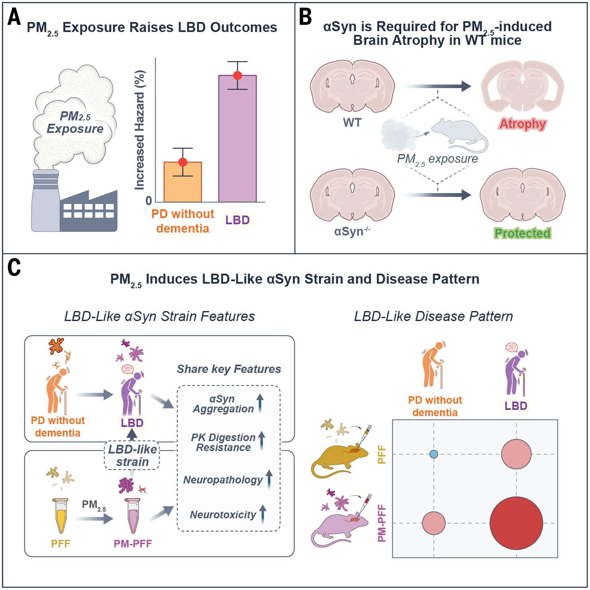 This study provides evidence linking PM2.5 exposure to LBD. The neurotoxic effects of PM2.5 appear to be mediated by αSyn, with exposure generating a pathogenic strain (PM-PFF) that shares key properties with αSyn strains in human LBD. In mice, this strain induced cognitive deficits and transcriptomic changes resembling those in LBD patients, distinct from those in PD without dementia. These findings identify an environmental mechanism contributing to LBD pathogenesis and underscores the role of αSyn. The PM2.5-induced strain represents a potential target for therapeutic intervention. Collectively, these results emphasize the importance of further research into air pollution’s role in neurodegenerative diseases and its implications for public health strategies.