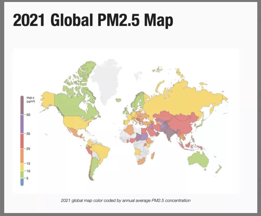 The image above gives a visual snapshot of global annual average PM₂.₅ levels, with notable hotspots in South Asia, parts of Africa, and the Middle East.