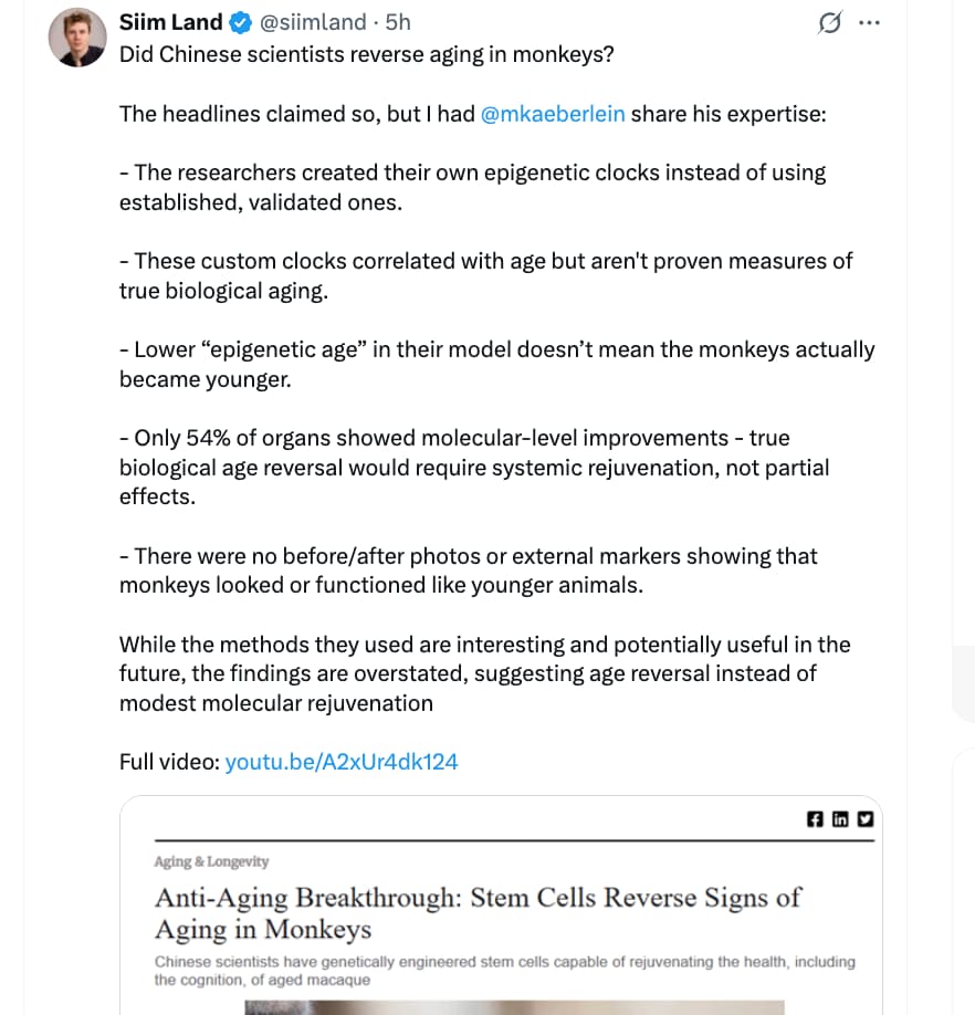 • Questions remain about whether the treated monkeys will experience an increase in lifespan, with speculation suggesting any potential increase may be minimal.