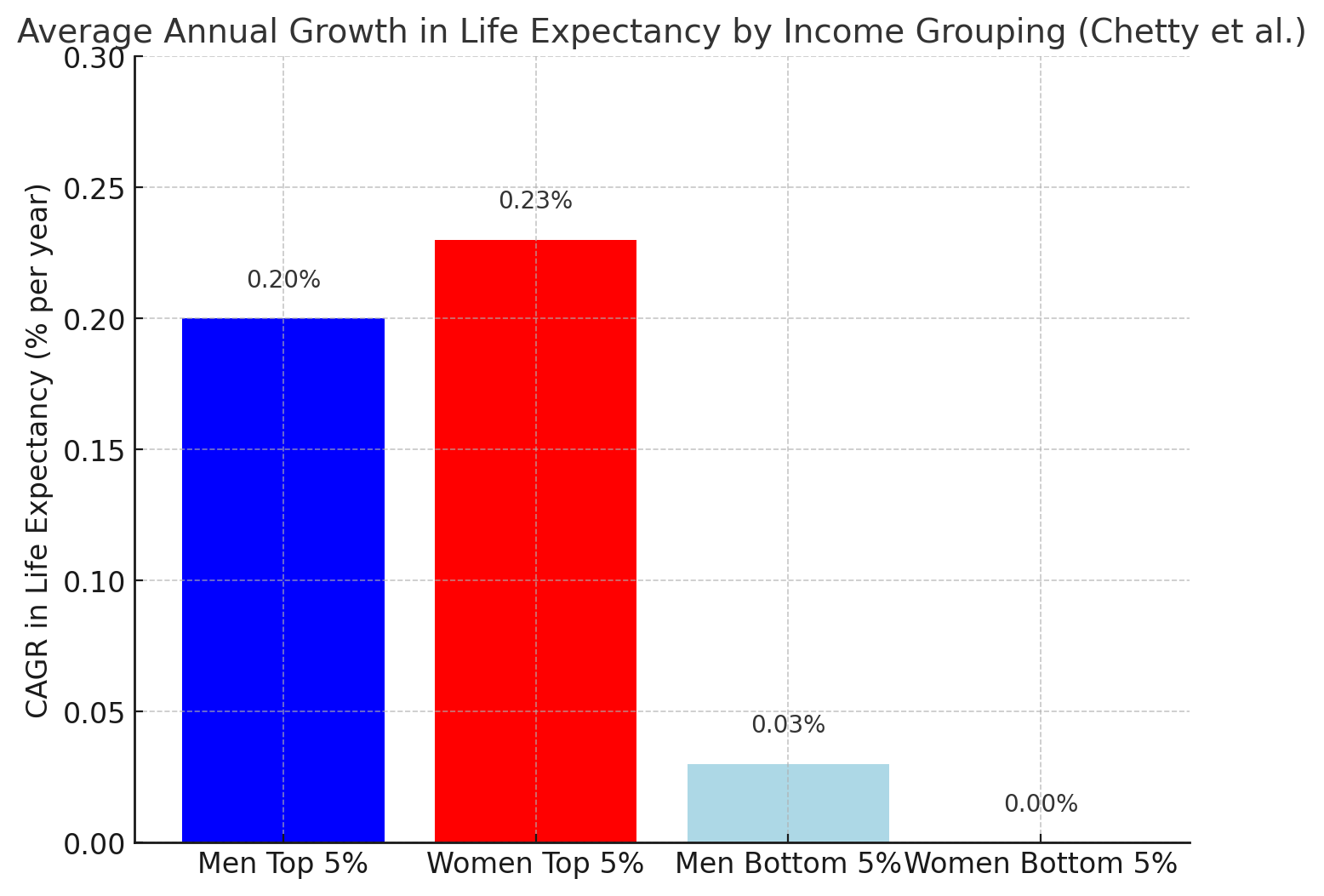 The Chetty et al. (2016) data already demonstrates how income stratification drives differences in life expectancy growth. Between 2001 and 2014:
