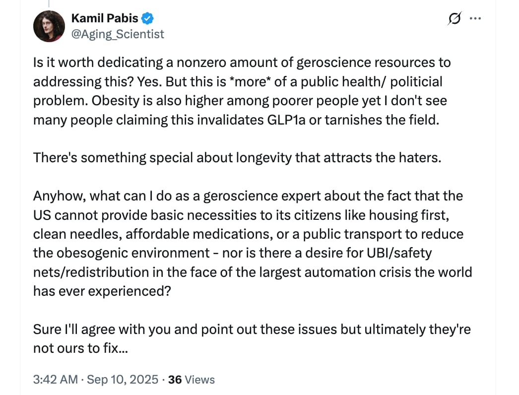 Meanwhile, look at reality. Do you really have to be a billionaire to get a full body MRI? What secret super expensive longevity treatment is available to billionaires that is not available to anyone on this site? Provable longevity intervention - CR… only available to billionaires? I’ve been on it for 8 years and never during that time have I managed to accumulate a $billion, not that I’ve tried or cared. And then we have the only other maybe LE, rapamycin - I wonder where my billions are, as I feed rapa to my cat.