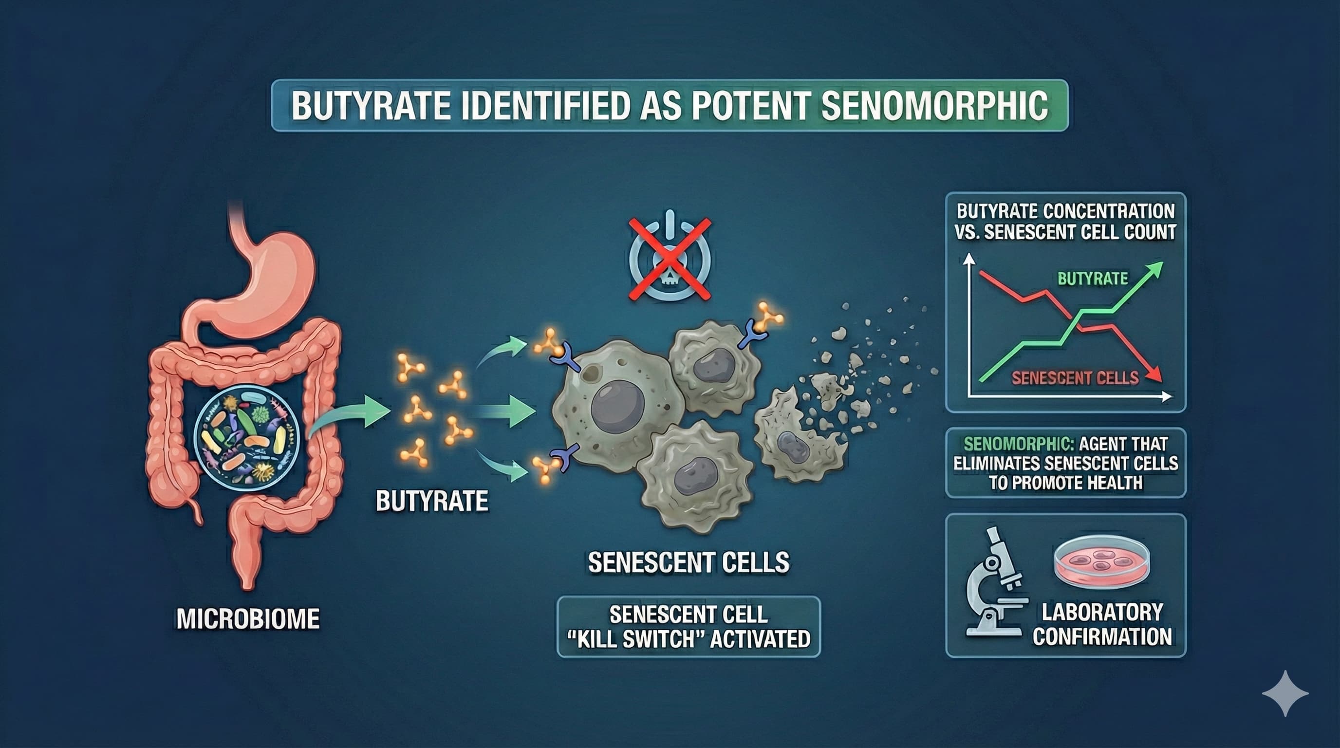 In a significant advancement for the “Gut-Longevity Axis,” researchers at the University of Birmingham and Quadram Institute (UK) have identified Butyrate—a short-chain fatty acid (SCFA) produced by bacterial fermentation of fiber—as a powerful senomorphic agent. Published in the prestigious journal Aging Cell, this study moves beyond the “kill all zombies” approach of senolytics (like dasatinib or quercetin) and instead proposes a “taming” strategy.