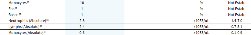 • Monocytes absolute: 0.50 \times 10^3/\mu L = 0.50 \times 10^9/L
