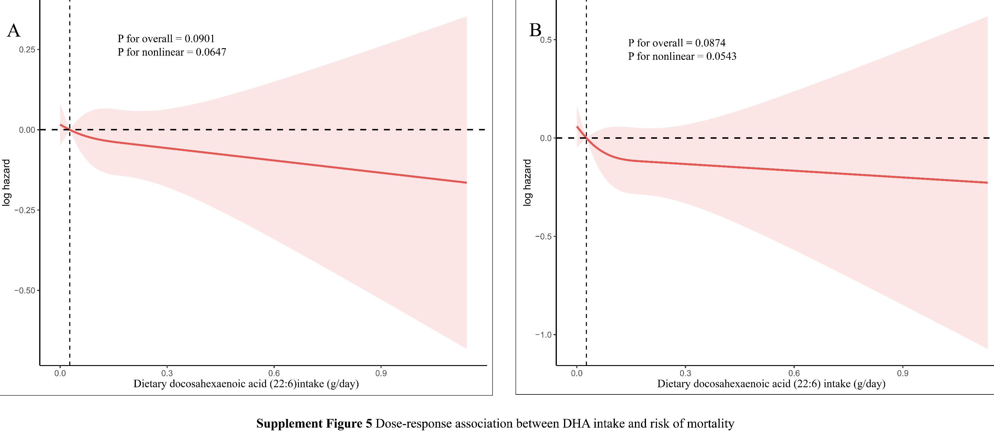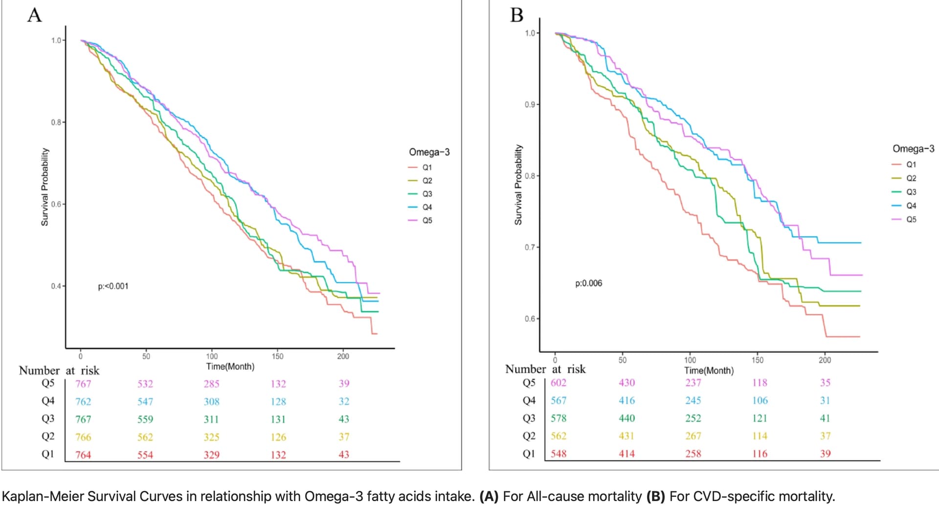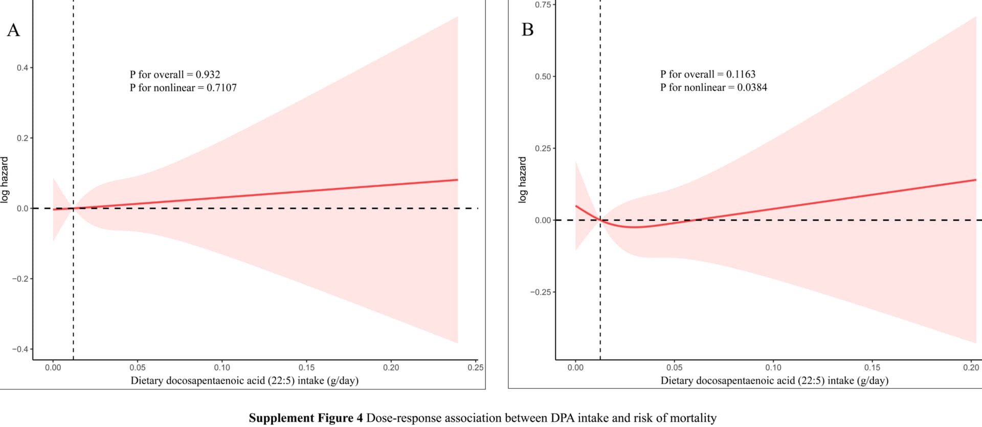 In the separate analysis of individual subtypes of the omega-3 fatty acid family, the consumption of alpha-linolenic acid (ALA) was obviously inverse-associated with CVD-specific mortality (HR of 0.64, 95% CI: 0.44–0.95). Nonetheless, the consumption of eicosapentaenoic acid (EPA), docosahexaenoic acid (DHA), and docosapentaenoic acid (DPA) did not show a significant association with mortality risk (P > 0.05).