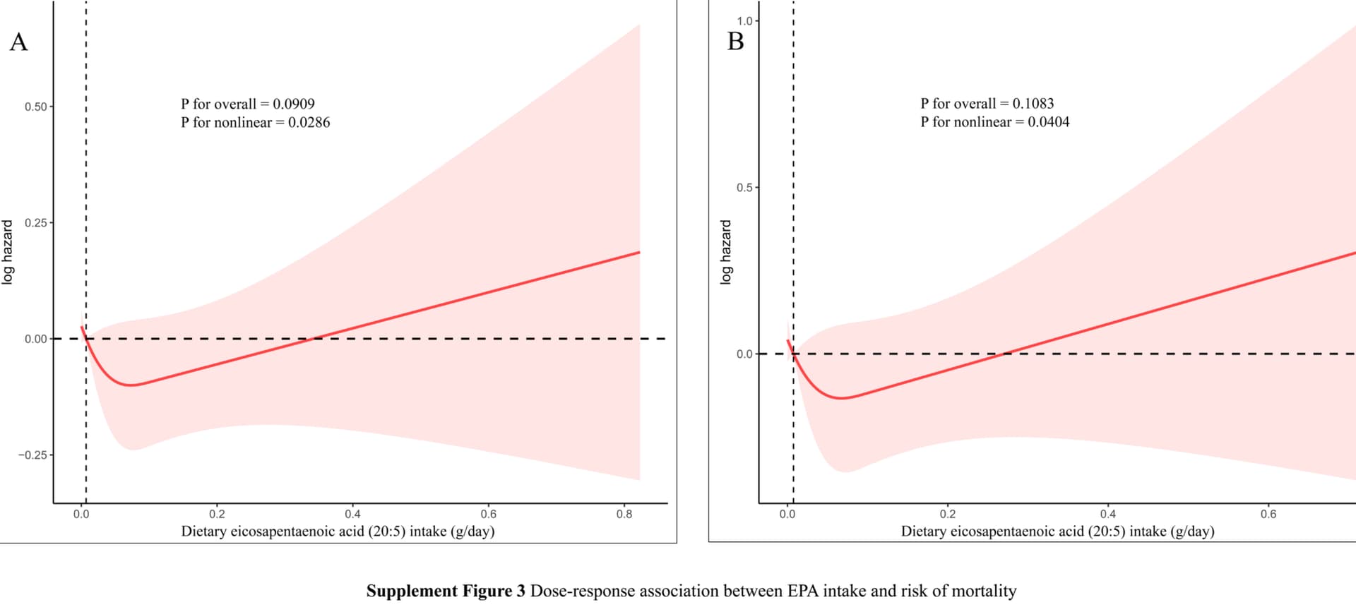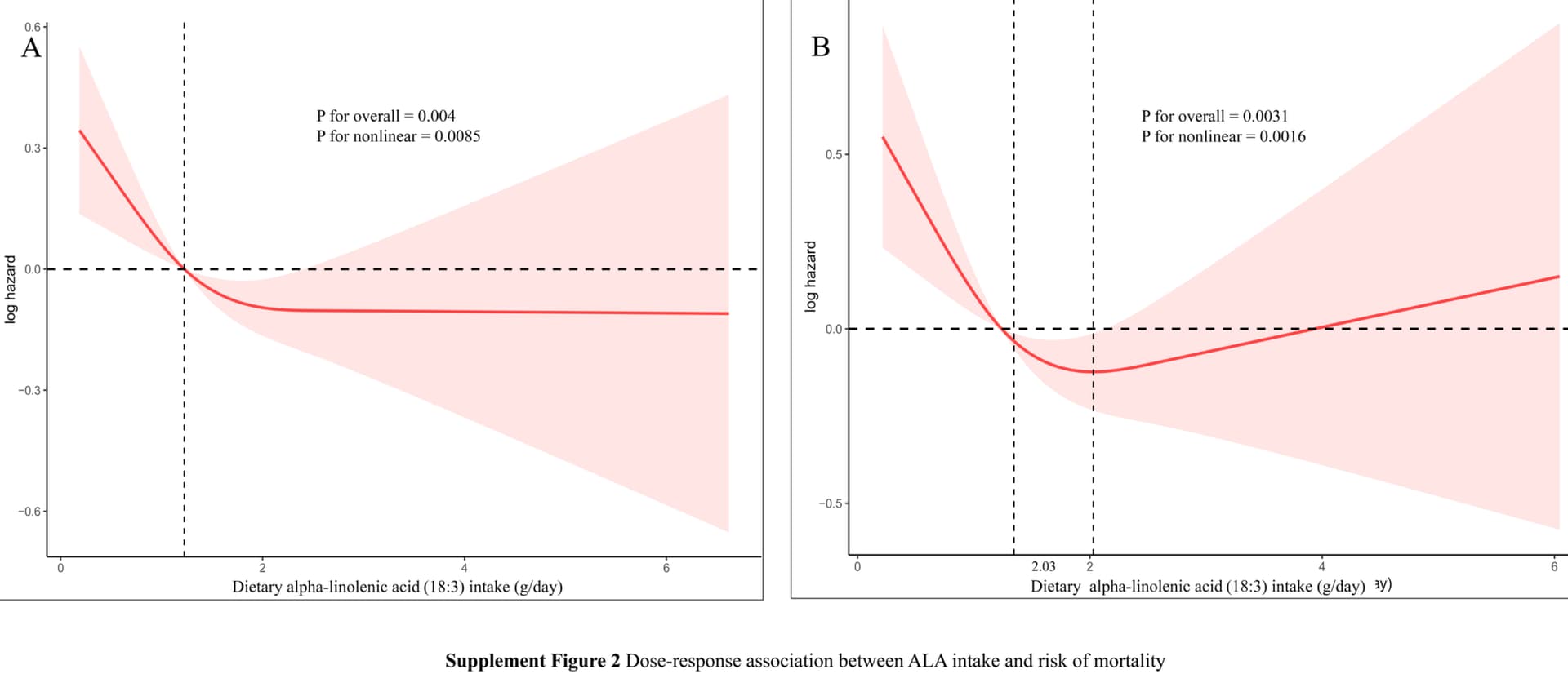 In the dose-response relationship analysis, total omega-3 fatty acid intake and ALA intake were observed to have an “L”-shaped nonlinear relationship with cardiovascular mortality, with the inflection points at 2.12 (g/day) and 2.03 (g/day), respectively. In summary, our research indicates that both total omega-3 fatty acids and ALA are inversely linked to the risk of all-cause mortality and cardiovascular mortality in patients with CVD.