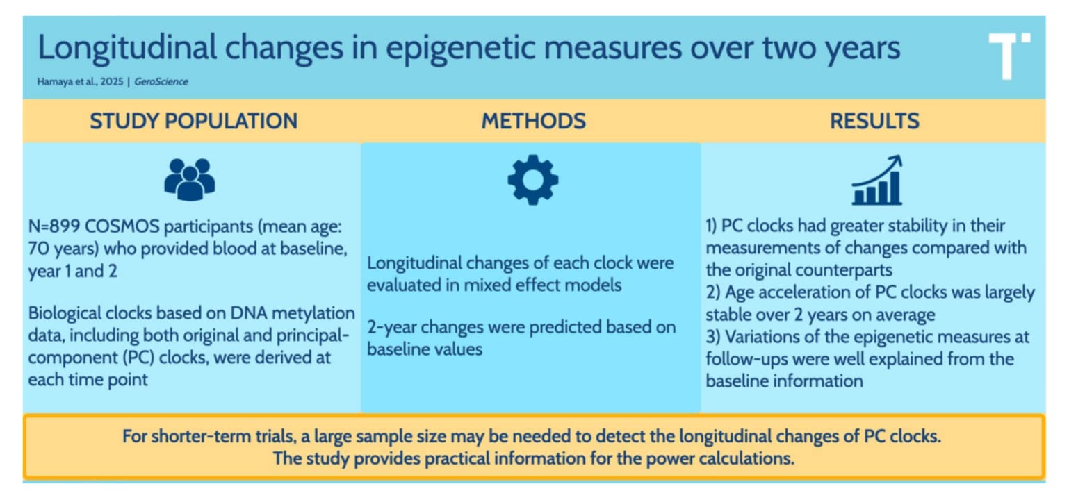 3. “Should I stop using the original GrimAge and switch to PC-GrimAge?” Answer: Yes. The study confirms PC (Principal Component) clocks have substantially lower variance and higher test-retest reliability. If you are paying for a test, ensure it uses the PC algorithm.