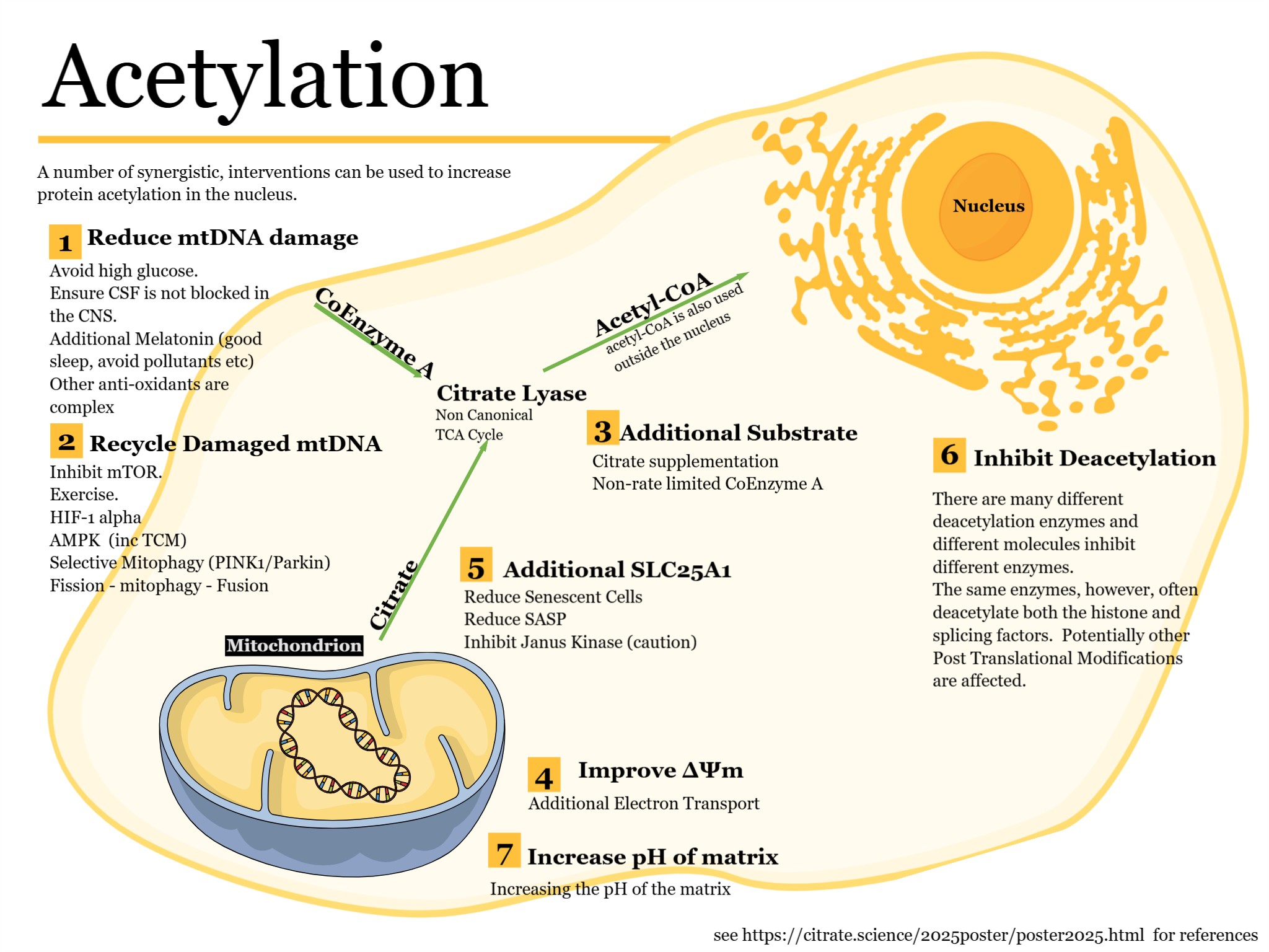 ACSS2 is interesting because of the acetate metabolism and it may also feed into the effects of things like cider vinegar and alcohol metabolism. However, ACLY and the relationship between SLC25A1 and nuclear acetyl-CoA seem to be the key pathways involved in affecting transcription changes and particularly those which are part of aging.