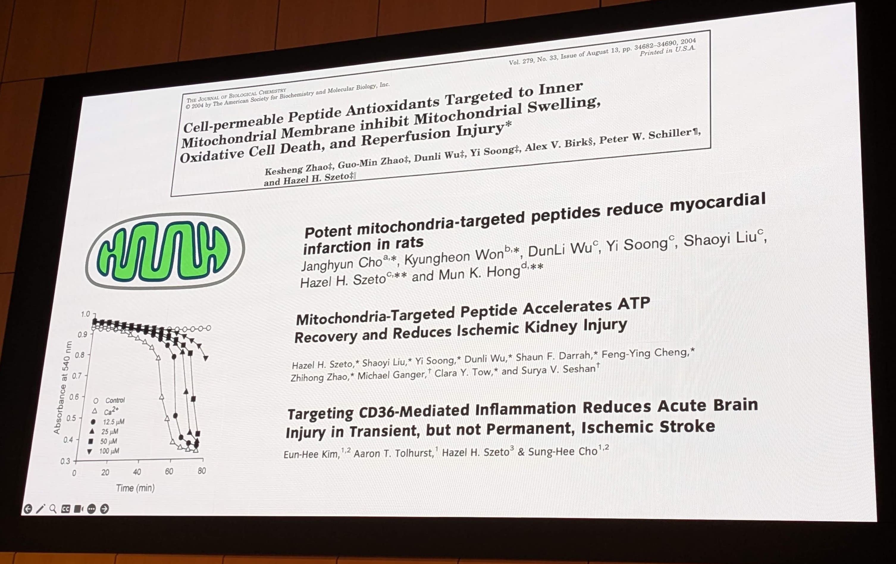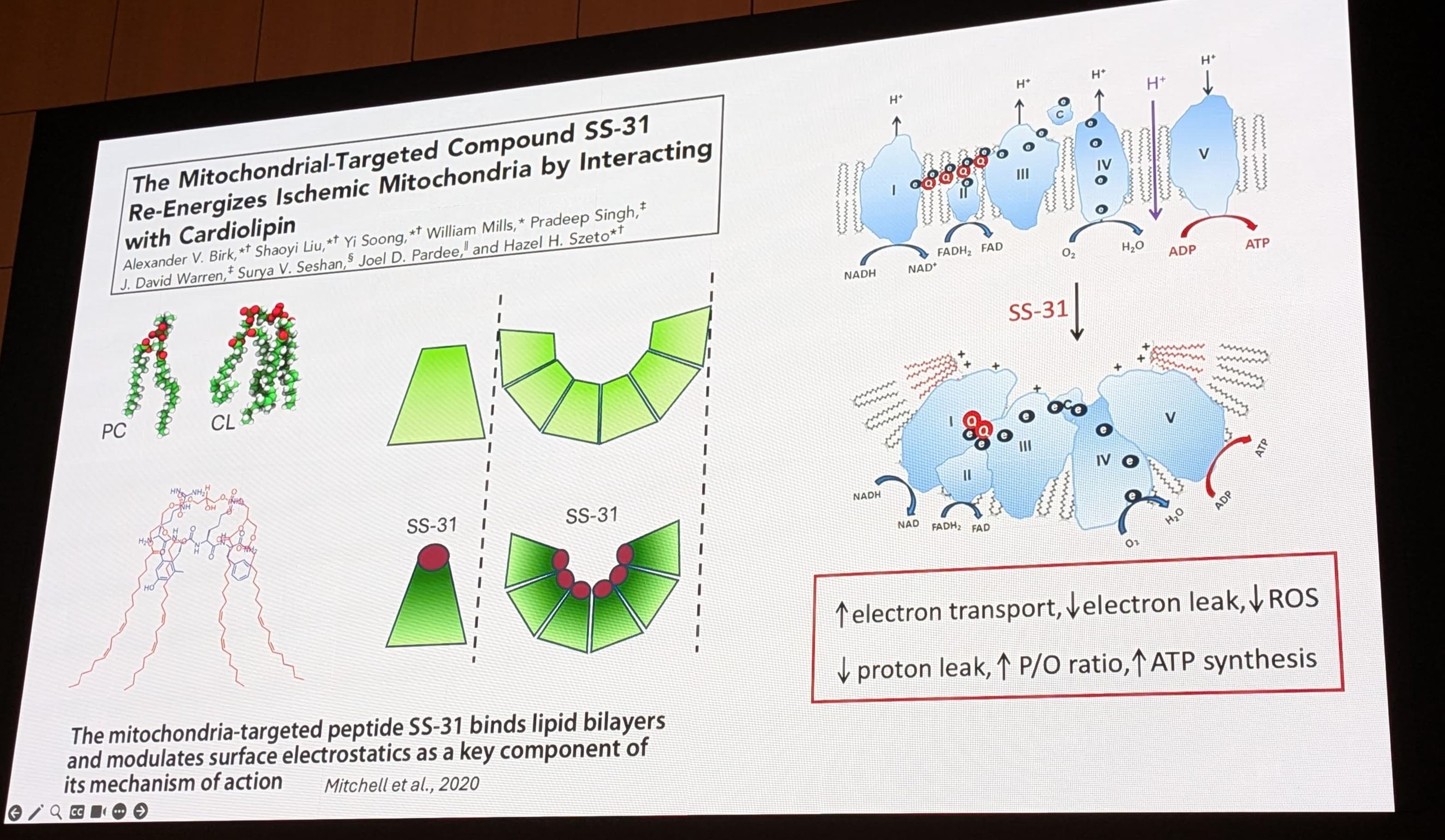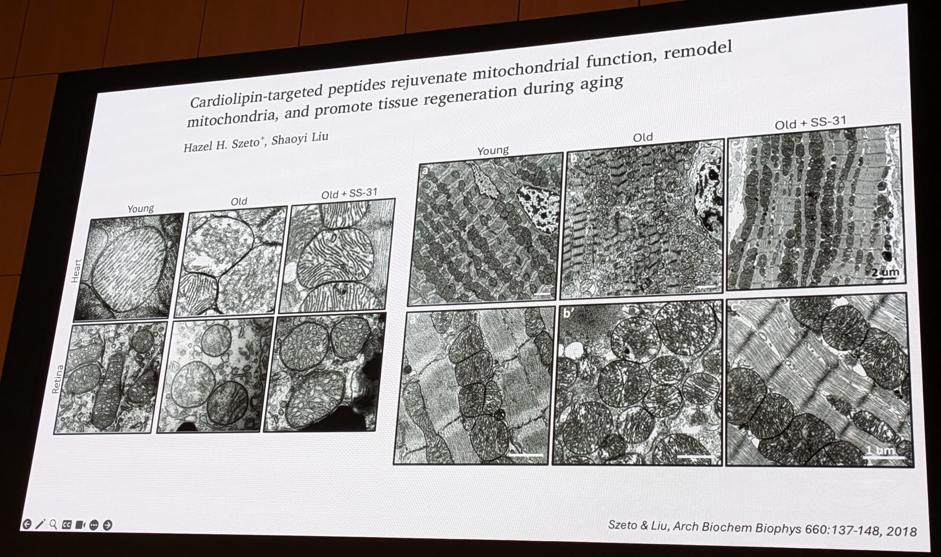I found this to be a very interesting presentation by Hazel Szeto, a researcher out of Cornell who discovered and refined the SS-31 Peptide that has now gotten FDA approval as part of Stealth Biosciences. And of course the SS stands for Szeto and Schiller (the two researchers) and there were 30 attempts before they arrived at the final version of the peptide.