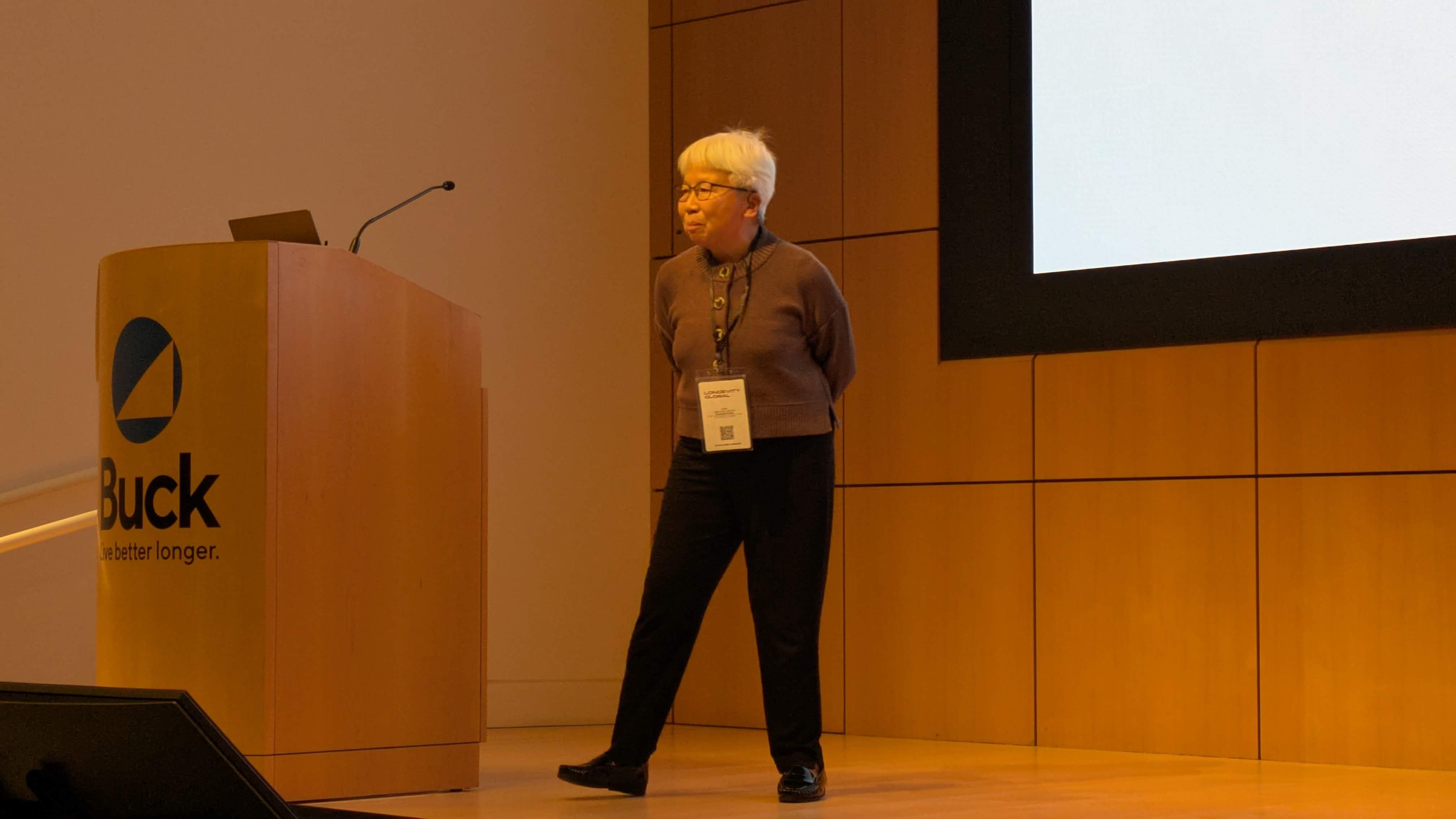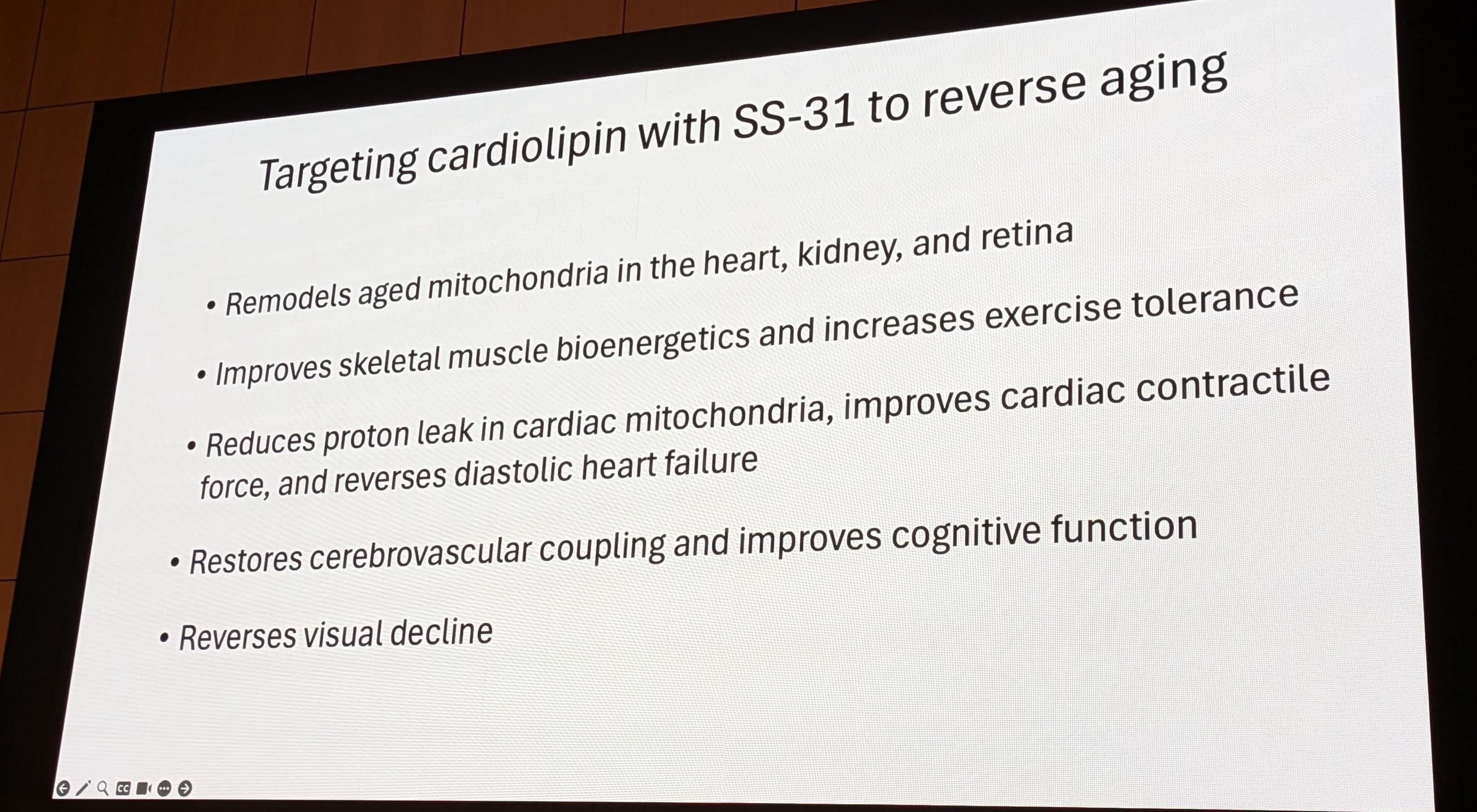 Hazel is an extremely engaging presenter… she told the fortuitous and unexpected discovery of SS31 and its abilty to target mitochondria throughout the body. Even more interesting was that she’s been using it herself for (what sounds like) a number of years now, and in fact says she tests all her new drugs on herself. She’s a very spunky and interesting woman.