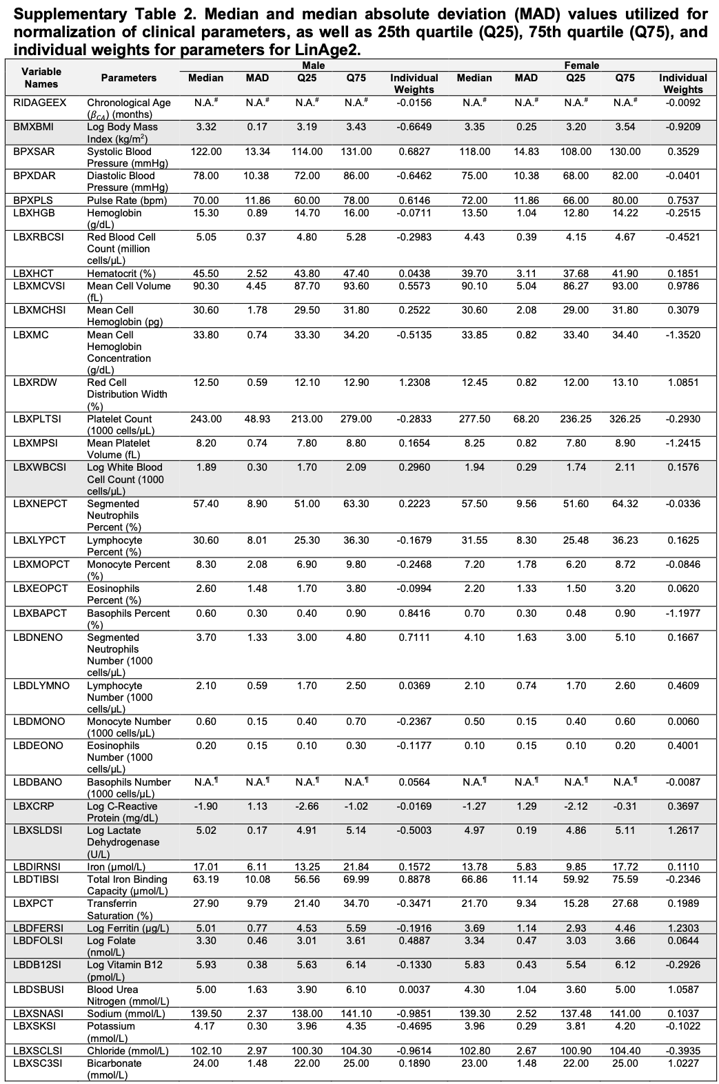 The LinAge2 biological age clock was built using 60 standard clinical and demographic variables drawn from the U.S. NHANES 1999ā2002 dataset. These were selected to maximize predictive power while ensuring broad availability from routine clinical tests.