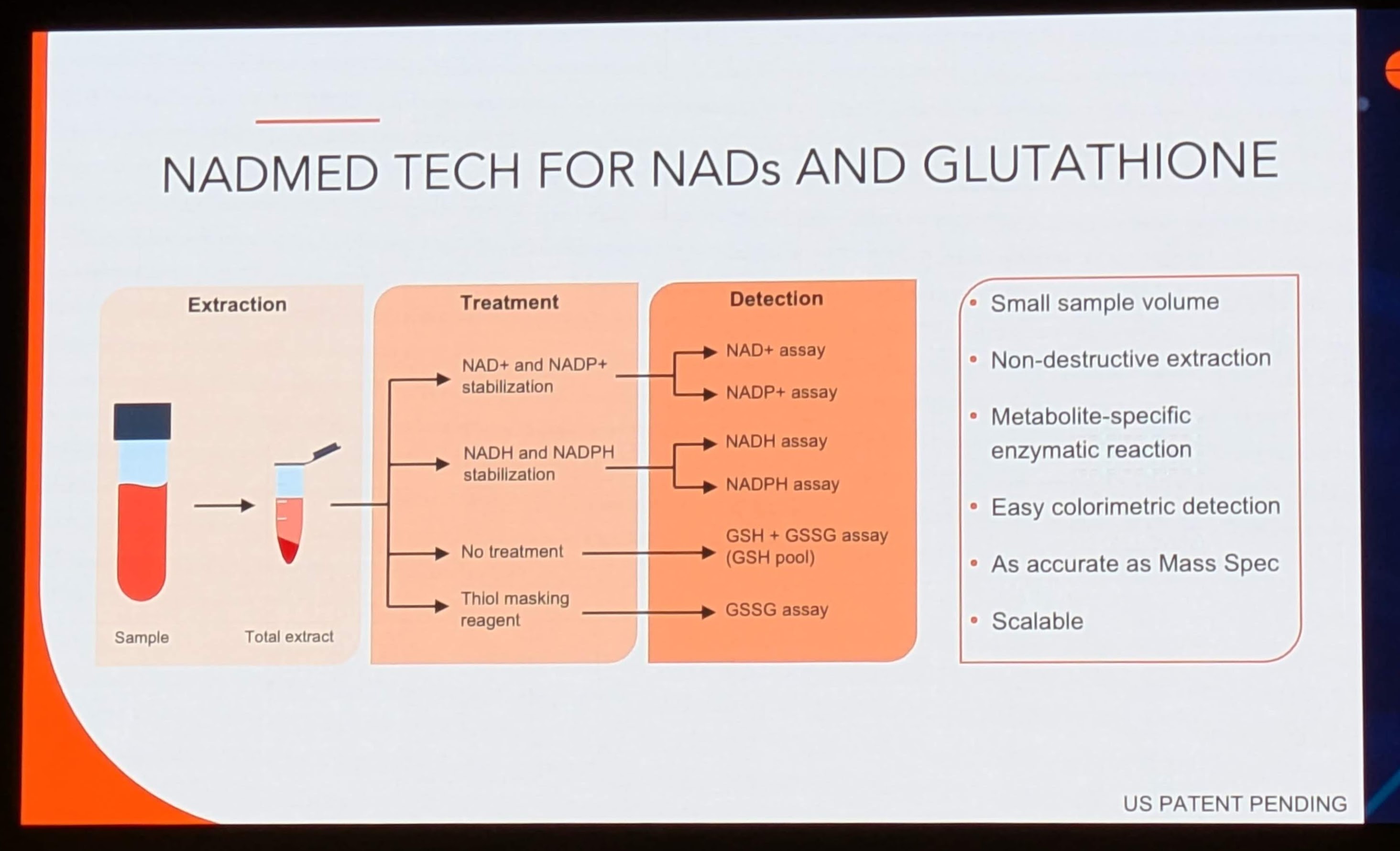 Image 2 (“NADMED TECH FOR NADs AND GLUTATHIONE”) details a specific workflow designed to circumvent these issues. The methodology is tripartite: Extraction, Treatment, and Detection.
