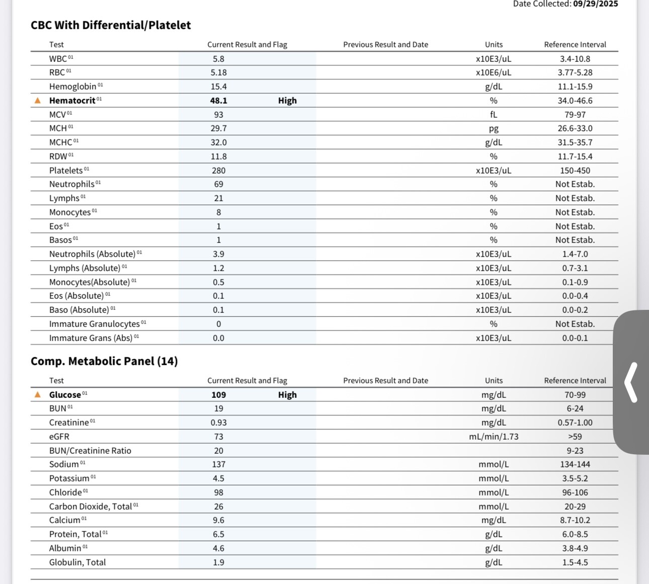 Mildly elevated — common with testosterone, dehydration, or high-protein intake. Strategies: Hydrate well, check ferritin and EPO levels, consider donating blood every 3–4 months if persistently >49%. Ensure oxygen saturation >95% (sleep apnea raises Hct). |