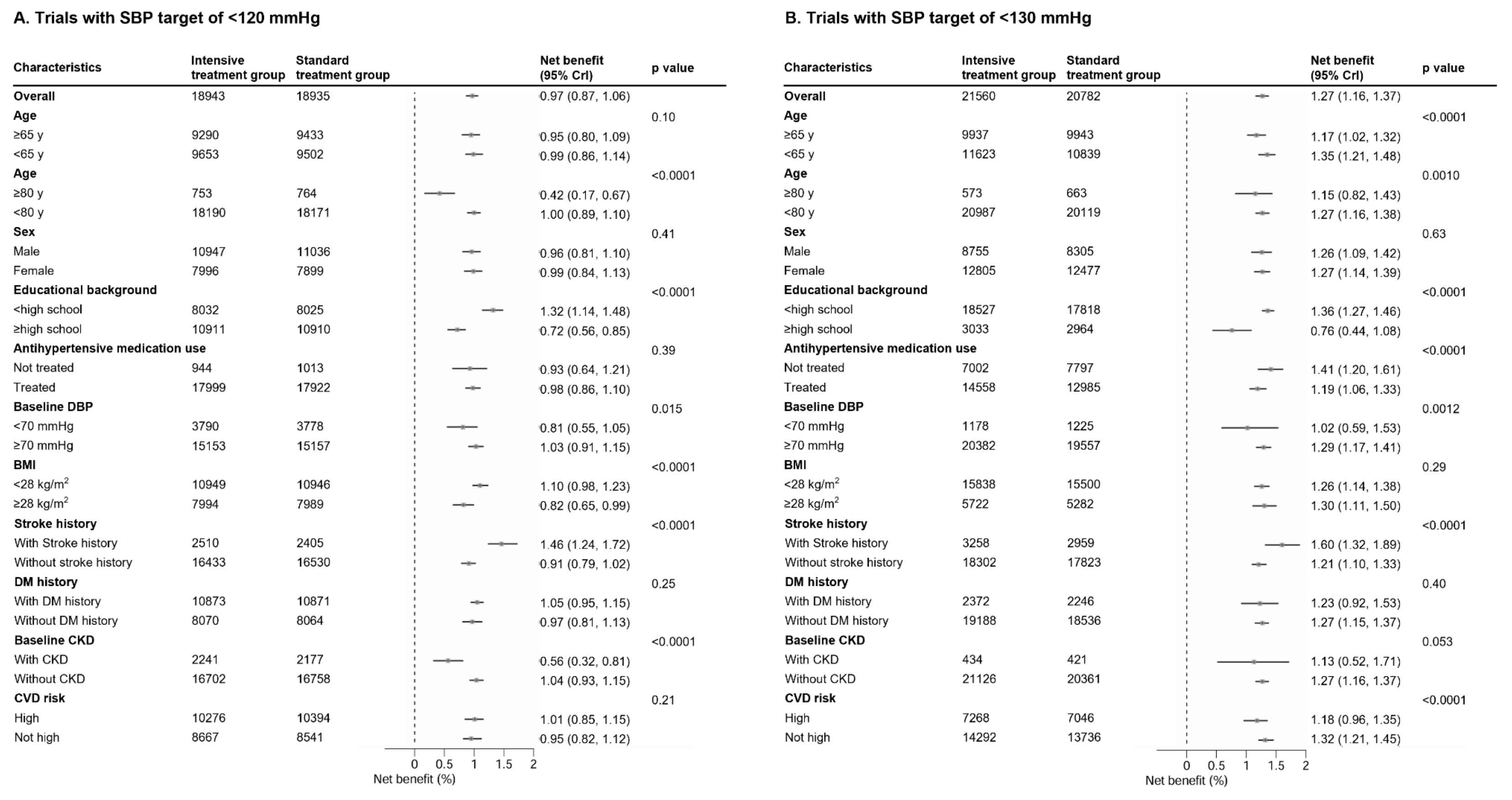 he initial dataset included 80 676 participants, of whom 80 220 were included in our analyses (intensive blood pressure control group n=40 503; standard blood pressure control group n=39 717). The median age was 64·0 years (IQR 59·0–70·0), 39 043 (48·7%) participants were male, and 41 177 (51·3%) were female. Most participants were Asian (66 290 [82·6%]) or White (8097 [10·1%]). During a median follow-up of 3·2 years (IQR 3·0–3·5), the composite cardiovascular disease outcome occurred in 2158 (5·3%) participants in the intensive blood pressure control group and 2811 (7·1%) participants in the standard blood pressure control group (hazard ratio 0·76, 95% credible interval [CrI] 0·72–0·81; p<0·0001). Compared with standard blood pressure control, intensive blood pressure control was associated with a 1·73% absolute risk reduction (95% CrI 1·65–1·81) in cardiovascular disease (number needed to treat 58 [95% CrI 55–61]) and a 1·82% absolute risk increase (95% CrI 1·63–2·01) for adverse events of interest (number needed to harm 55 [95% CrI 49–61]). Overall, intensive blood pressure control showed a favourable benefit–harm profile, with a net benefit of 1·14 (95% CrI 1·03–1·25), using adjudicated weighting. The net benefit remained positive when considering kidney-related adverse events (1·13 [95% CrI 1·01–1·24]).