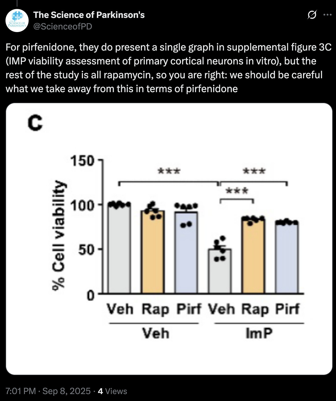 They write “the reversal of imidazole propionate-induced neurotoxicity by the p38γ inhibitor pirfenidone” but they only proved reversal with rapamycin. Weird. In any case @John_Hemming & @DrFraser it shows (again) that rapamycin could theoretically reverse some PD symptoms via the gut axis.