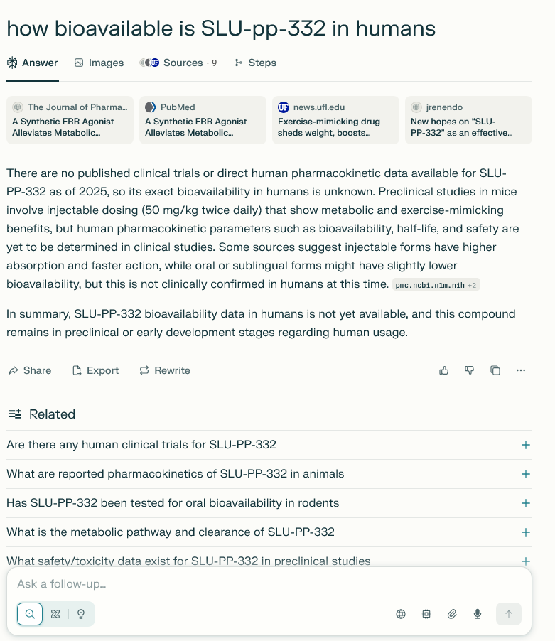 - Transcriptomic analyses showed that SLU‑PP‑332 induced an acute aerobic exercise gene program that depended on ERRα activation; ERRα activation was necessary for the improvement in endurancepubmed.ncbi.nlm.nih.gov.