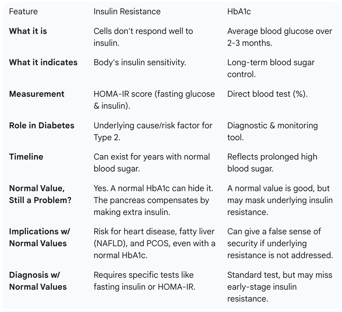 A normal HbA1c is a positive indicator, but it does not rule out the presence of insulin resistance.