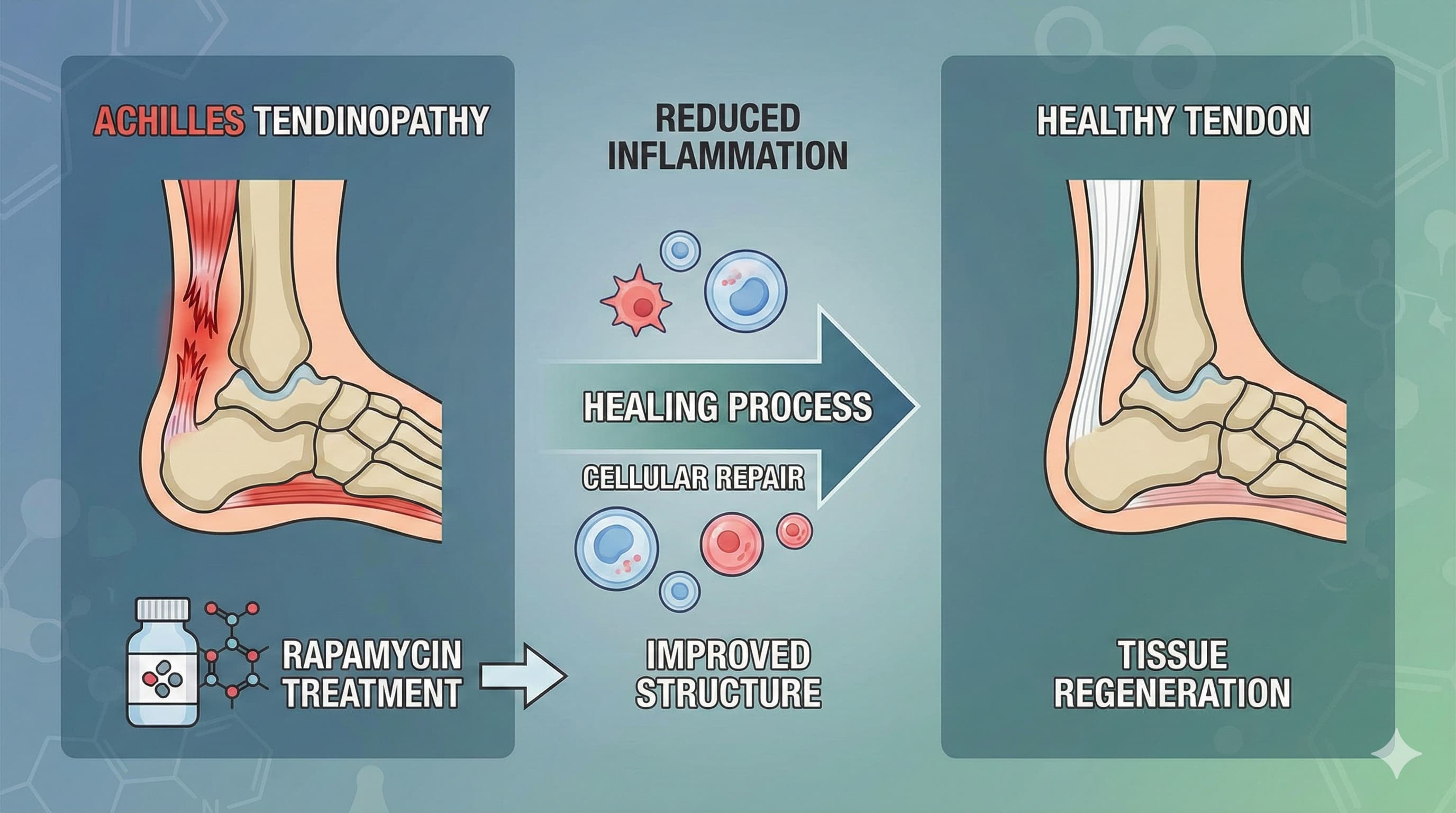 Rapamycin is the flagship mTOR inhibitor in aging research, with systemic benefits reported in multiple organs. This new study asks a narrower question: can rapamycin help repair an overused Achilles tendon? In a rat model, researchers injected collagenase into the Achilles to mimic tendinopathy, then treated animals with a daily intraperitoneal injection of rapamycin (5 mg/kg). Tendons were followed for 2–8 weeks with histology, immunostaining, Western blotting of the mTOR axis, and 8-week biomechanical testing.