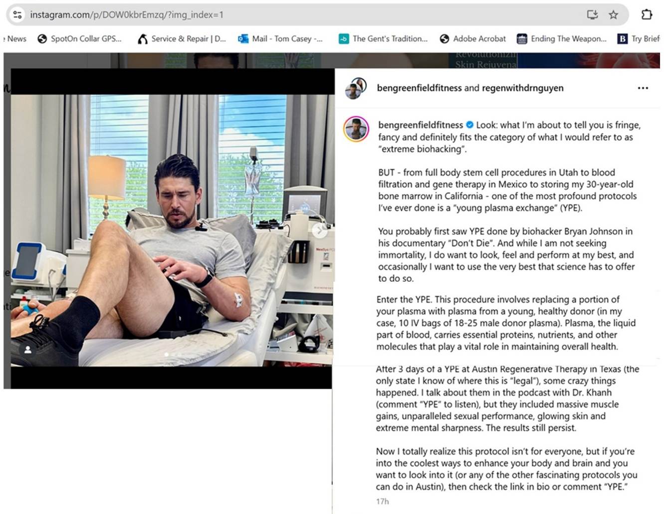 Even though the experiment was in mice, not humans, it kicked off a US West Coast craze for “young blood”. One tech billionaire — the longevity evangelist Bryan Johnston — tried out transfusions of plasma, the liquid component of blood that carries blood cells, from his teenage son.