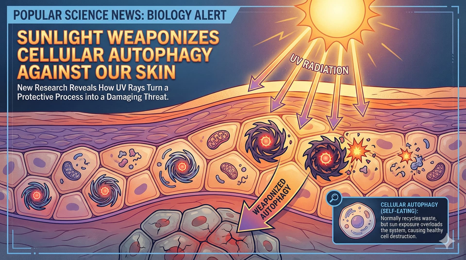 The University of Chicago team, led by Dr. Yu-Ying He and Dr. Chuan He, discovered that UVB radiation triggers a “kill switch” for YTHDF2. In a cruel twist, the radiation activates autophagy—the very process usually praised for extending life and cleaning cells—to specifically target and digest the YTHDF2 protein. With the guardian removed, the “viral mimic” U6 snRNA floods the system, triggering a massive inflammatory response that drives sunburn, tissue damage, and eventually, skin cancer.