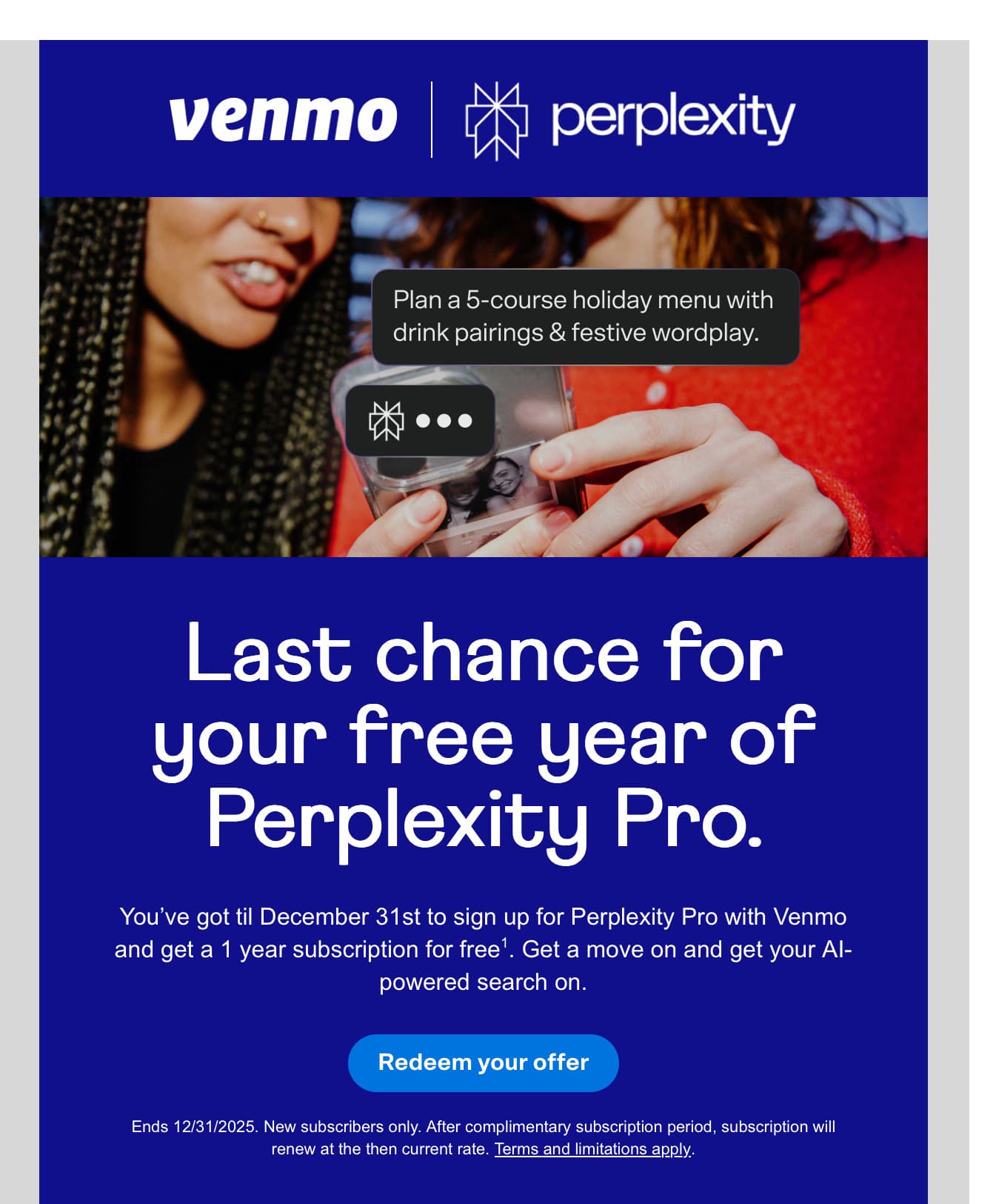 For those of you who have Venmo, look for an offer in your inbox to get one year free of Perplexity Pro. I was about to delete it!